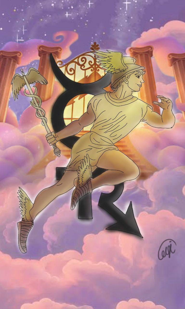 Roma mitolojisinden aşina olduğumuz Tanrı Merkür, Yunan mitolojisinde Tanrı Hermes olarak geçer. O gezici bir enerjiye sahiptir, çok yöne meyillidir. Tanrılar arasında haber taşır. Ulaktır. Fiziksel ve zihinsel olarak oldukça hızlıdır. Yukarıdan aldığını aşağıya, aşağıdan aldığını yukarıya iletir. Bu güç ona iki olası dünya arasında köprü kurma özelliği kazandırır. Böylece ölülerin yer altı dünyasına geçişini sağlayabilir. Bir yandan da Olympus’ta Zeus’a lir çalıp onu sanatı ile büyülerken karşımıza çıkar. Muazzam el yetenekleri, hızı ve zekâsı ile finansal konular, ticaret, iletişim, bilgi, kehanet yeteneği, gezginlik, hile ve hırsızlığın sembolü olmuştur.
